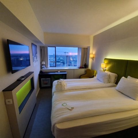 Wenige Tage nach der Buchung bekam ich eine E-Mail mit einem Angebot für ein Upgrade. Nun wohnten wir auf einer der höheren Etagen und hatten ebenfalls einen schönen Ausblick auf die Stadt. Aktuell wird allerdings viel gebaut in der Umgebung, aber wer schon immer mal Bauarbeiter bei der Arbeit an einem Hochhaus sehen wollte, der ist im Moment in dem Hotel gut aufgehoben. Jedoch reichte der Blick noch viel weiter und wir erkannten einige Wahrzeichen der Stadt. Das Bett war gemütlich und reichte für einen Ausflug über ein Wochenende vollkommen aus. Das Badezimmer war sauber, der Wasserdruck zufriedenstellen und jede Menge kleine Extras sorgten dafür, dass ich nur einen Bruchteil der Dinge aus meinem Kulturbeutel nutzte. Durch das Upgrade hatten wir eine Kaffeemaschine, die auch mit Tee-Kapseln zu füllen war. Doch wenn ständig Kaffee gebrüht wird in einer solchen Maschine, dann ist der Kaffeegeschmack auch im Tee zu schmecken. Ich hatte ausgezeichnetes WLAN auf dem Zimmer, welches im Vergleich zu anderen Hotel-Erfahrungen weit über dem Durchschnitt liegt.